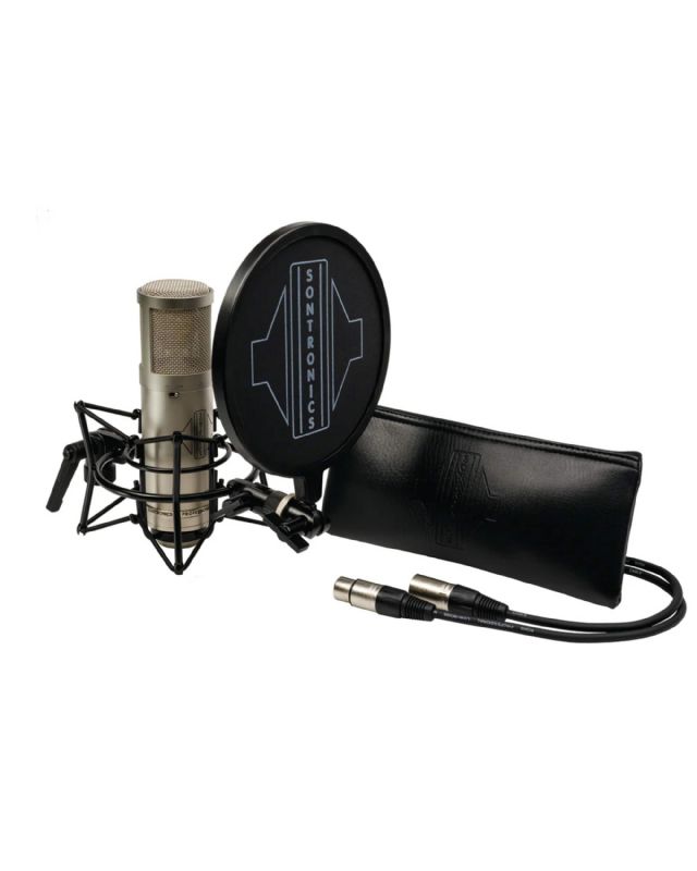 Vocal, cardioid large-diaphragm studio mic, Phantom-powered. Two-stage high-pass (flat/75Hz) and pad (0dB/-10dB) switches. Max 125dB SPL. Supplied c/w 'spider' shockmount, pop-shield, zip-up pouch and 5m XLR mic lead. Silver finish.
